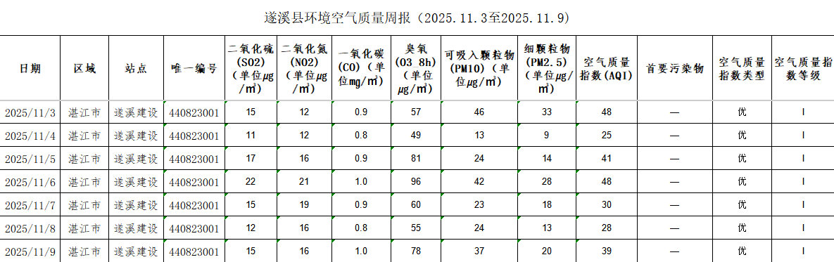 遂溪縣環(huán)境空氣質(zhì)量周報(bào)(2025.11.3至2025.11.9)