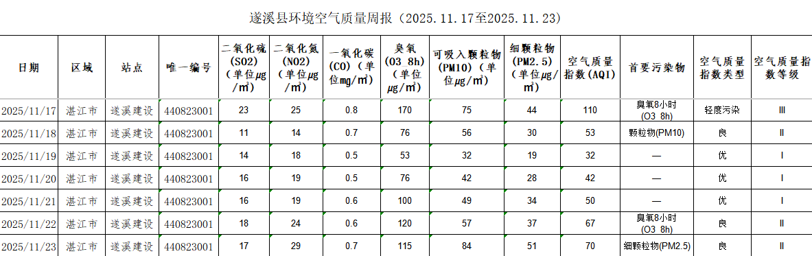 遂溪縣環境空氣質量周報(2025.11.17至2025.11.23)